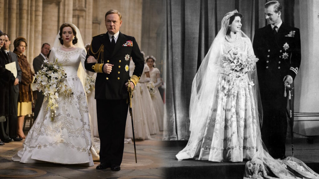 Платья и декорации составляли большую часть бюджета сериала. Например, для воссоздания свадебного платья королевы понадобилось около 30 тысяч фунтов стерлингов. На свадебное платье принцессы Дианы ушло 95 метров ткани, 100 метров кружева, 30 метров шлейфа, 10 недель работы по 12 часов — и все это ради короткого эпизода. Кстати, во время работы над свадебным нарядом Елизаветы тоже возникли трудности. Дело в том, что современные ткани производятся на несколько дюймов уже, чем в XX веке. Художники по костюмам отказались сшивать два отреза, так как был бы виден шов. Поэтому и шлейф наряда был несколько уже, чем у оригинального платья.